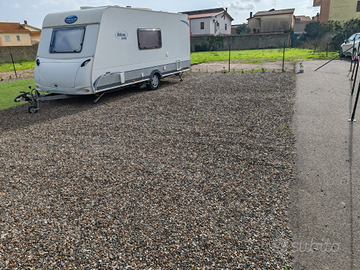 Circa 40mq coperti con erba sintetica alta 35mm, una piccola fetta asfaltata e la restante parte ghiaiata.