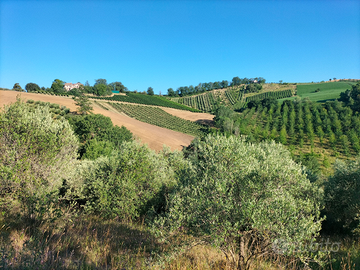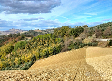 Prima porzione: 13 ettari circa di terreno collinare già coltivati a seminativi, ora adibito a piantagione da legno costituita da 2400 piante di ciliegio e 600 di noce. Piantagione espiantabile secondo le direttive regionali già dal mese di Gennaio 2025 per la produzione di biomasse energetiche, legname da ardere o per l'industria del legno + 5 ettari circa di bosco ceduo costituito da Querce, frassini, olmi, carpini, pioppi. Euro 100.000