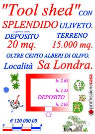 La superficie del fondo (parzialmente recintato ma tutto ben delimitato da alberi) è poco oltre i 15.000 mq., inserito in zona urbanistica classificata come "E2" - agricola a colture tradizionali - pertanto NON EDIFICABILE. All'interno trovi un "TOOL SHED" ovvero un piccolo magazzino caratterizzato da un unico ambiente (non servito da acqua e luce). Censito in categoria catastale "C2". Superficie lorda di 20 mq. (netti 12 mq.) con tetto a due falde (altezza massima 3,35 mt e minime 2,65 mt.). DA RISTRUTTURARE.