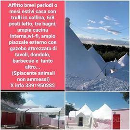 Affitto brevi periodi o mesi estivi casa con trulli in collina a Monopoli, 6/8 posti letto, tre bagni, ampia cucina interna, wi-fi, ampio piazzale esterno con gazebo attrezzato di tavoli, dondolo, barbecue e tanto altro...
