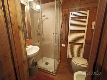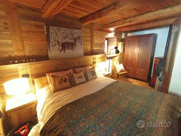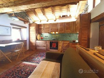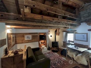L'abitazione si sviluppa su due livelli con doppio ingresso. Al piano terra si trova la zona notte, composta da una camera da letto accogliente e un bagno. Al primo piano si apre la zona giorno in open space, con soggiorno e angolo cottura arredati con cura. La cucina è dotata di piano cottura a induzione e forno, perfettamente integrati nello stile montano dell'ambiente. Completa il piano un soppalco regolarmente accatastato, ideale come zona relax. Gli arredi in noce massello donano un'atmosfera calda e autentica, perfetta per chi cerca il vero spirito della montagna.