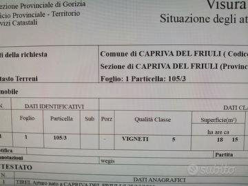 Vendesi vigneto produttivo DOC di 1815 mq a Capriva del Friuli zona via Pottendorf. Il vigneto è composto da 6 filari lunghi oltre 100 metri principalmente a merlot di oltre 30 anni. Da sistemare Il terreno è dotato di pozzi irrigui del consorzio di bonifica Vigneto regolarmente registrato in Visura catastale della agenzia delle entrare. Prezzo medio mq per vigneto DOC 8.5 euro... In vendita a 7.5 euro a mq trattabile Le quote vigneto sono scadute ma sono tranquillamente ripristinabili con coldiretti o enti preposti per una spesa di circa 1000 euro Di conseguenza avendonquote scadute ma ripristinabili Il prezzo è inferiore a quello di mercato. Valuto proposte Contattemi per info!