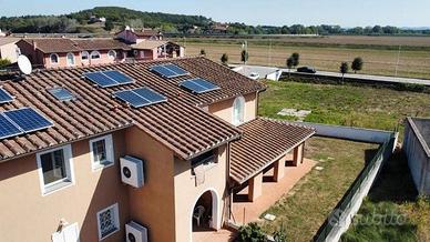 Villetta a Rustico porzione laterale, nuova costruzione 80 mq a piano oltre a locale tecnico con ingresso indipendente e composta al piano terra da ampio soggiorno, cucina abitabile con accesso in giardino, studio, ripostiglio e bagno con doccia, locale sala macchine; al piano primo due camere matrimoniali, camera singola, bagno con vasca. Riscaldamento a pavimento, parquet nel reparto notte, predisposizione impianto allarme e condizionatori, pannelli solari e predisposizione fotovoltaico, ampio giardino di circa 350 mq, annesso garage di 22 mq e posto auto.
