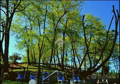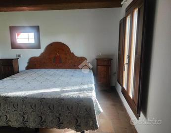 Costruita su due livelli per circa 400 mq complessivi, la struttura presenta sei locali con cucina-sala colazione e camera da letto, un portico, una sala da pranzo comune e una grande aia circondata da secolari piante di acacie. Riscaldamento a pavimento.