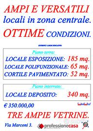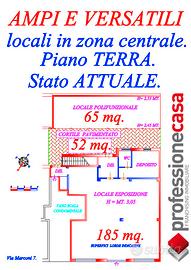 Piano terra: locale esposizione mq. 185 + vano polifunzionale esterno mq. 65. (allo stato attuale su questo vano è in corso una pratica di sanatoria) + cortile pavimentato mq. 52. Piano Interrato: 340 mq. con altezza netta di mt 2,80. Tutte le unità immobiliari sono censite in Categoria Catastale C/2.