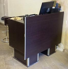 -Banco cassa in legno scuro.