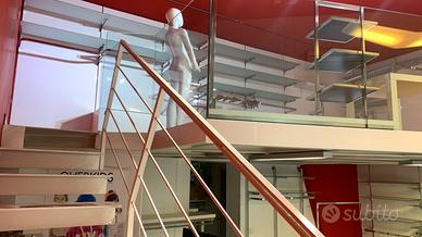 VENDO ARREDO COMPLETO per avviare la tua attività Esposizione di mensole in vetro e appenderia con pannelli di legno lucido per circa 50 metri lineari + Tavoli grucce manichini cassa pc bancone cassettoni