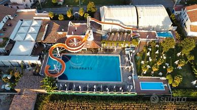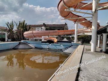 Piena proprietà di fabbricati e locali per esercizi sportivi. Il complesso è composto da piscina con scivolo (non compreso nella presente procedura in quanto non rappresentato nei disegni dei beni pignorati), piscinetta con fabbricati di pertinenza, collegata ad altra attività di ristorazione di terzi non oggetto di esecuzione, tettoia a sbalzo, bagni con sovrastante terrazza, gazebo chiuso su tre lati utilizzato per ristoro e altre attività e locale tecnico, il tutto su area di circa mq. 2.200,00. Superficie commerciale delle strutture costruite sul mappale 243 sub. 1 di circa mq. 630,00.