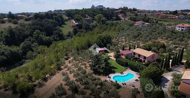 MONTEFIASCONE Splendido agriturismo avviato immerso nel verde vicinissimo al centro. Proponiamo in vendita un'incantevole azienda agricola con attività agrituristica già avviata, situata in una posizione strategica a pochi km da Civita di Bagnoregio, dalle terme di Viterbo, da Bomarzo con il celebre "Bosco Sacro" e dal Lago di Bolsena. La proprietà, immersa nella quiete e nel verde di oltre 3,5 ettari di terreno con pozzo privato, comprende piante di alto fusto, ciliegi, ulivi, noci e alberi da frutto. Tra i ciliegi si potrebbe realizzare un suggestivo glamping, offrendo agli ospiti un'esperienza unica a contatto con la natura. La struttura è composta da sei appartamenti speculari di circa 50 Mq ciascuno, disposti su due livelli e completamente attrezzati. Ogni unità è dotata di angolo cottura, soggiorno, camera da letto, bagno con doccia e giardino privato, offrendo agli ospiti comfort e privacy. Adiacente alla struttura si trova la residenza principale dei proprietari, di circa 150 Mq tutti su un unico livello, composta da ampio soggiorno con angolo cottura e splendido camino, due camere da letto, due bagni, portico chiuso con affaccio sul cortile e garage sottostante di circa 40 Mq. Completa la proprietà una dependance di circa 50 Mq, composta da tre vani, bagno e portico, ideale da adibire a spa, area benessere o spazio multifunzionale. Il portico della dependance può essere chiuso per ottenere ulteriore spazio e adattarsi a diverse esigenze. All'esterno, un grande giardino panoramico ospita una splendida piscina con chiosco bar tutto attrezzato, perfetta per il relax e per accogliere gli ospiti durante la stagione estiva. Un suggestivo stagno con carpe giapponesi Koi contribuisce a creare un'atmosfera di assoluta tranquillità e fascino naturale. Un'occasione unica per chi desidera investire in una struttura ricettiva già operativa, oppure per chi sogna di vivere immerso nella natura senza rinunciare alla vicinanza dei servizi. L'agenzia lavora nel rispet