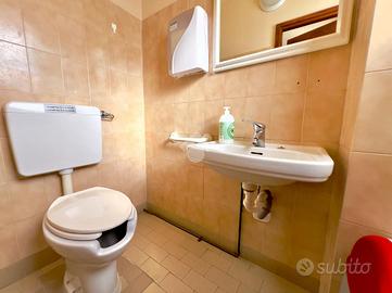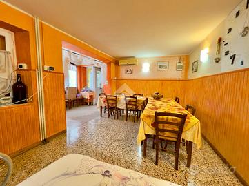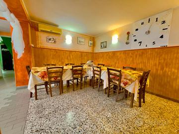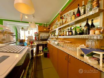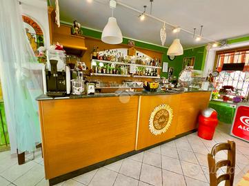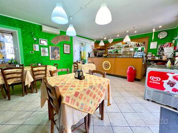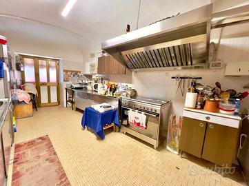 Il piano terra è composto da un primo ambiente di circa 30 mq dove è presente il bancone bar e tavoli. La cucina adiacente è di circa 15 mq. Il piano è completato da un'ulteriore locale di circa 20 mq utilizzabile come sala ricevimento e da un primo bagno.
