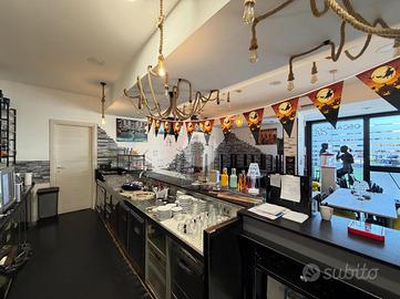 Bancone bar completo con vetrina refrigerata, macchina del caffè professionale, lavastoviglie, frigoriferi, spillatrice per birra e forno per cornetti;
