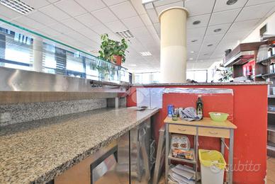 L'ingresso si apre sull'ampio salone dedicato ai tavoli e alla zona bar: quest'area, di circa 105 metri quadrati, è molto luminosa grazie alle grandi vetrate che ne percorrono l'intero perimetro, creando un'atmosfera ariosa e accogliente. La pizzeria a vista, dotata di un forno a legna, rappresenta un punto di forza dell'attività e precede l'ingresso nella cucina. Quest'ultima, di circa 20 metri quadrati, comunica con il vano dispensa.