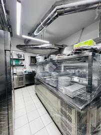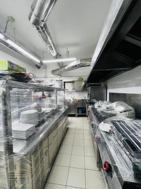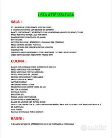 * Cucina professionale completa di ogni attrezzatura: frigoriferi, piani cottura, cappa aspirante, friggitrice, lavastoviglie, banchi lavoro in acciaio e utensileria varia;