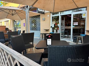 All'esterno concessione suolo di mq 12 con pedana il legno rialzata con doppio ombrellone e vani bidoni spazzatura e 4 fioriere.