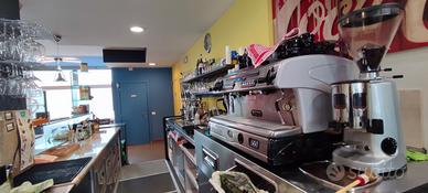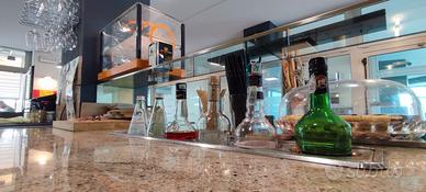 Il bancone attrezzato dispone di ampia esposizione refrigerata per alimenti freschi e pasticceria, macchina del caffè professionale doppia postazione, scaffalature portabottiglie retroilluminate ed eleganti lampade sospese sopra l'area servizio. Sono presenti inoltre climatizzazione autonoma caldo/freddo già installata ed impiantistica recente a norma.