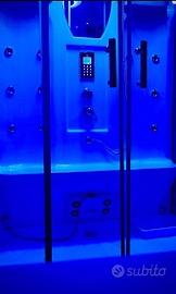 Area benessere con vasca idromassaggio cromoterapica, cabina doccia con bagno turco, nuovissima sauna combi finlandese e infrarossi con due livelli di panche, area massaggi e relax.