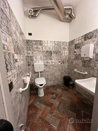 87mq interni, 35mq esterni, 2 sale principali, una sala interrata, un bancone di 3,5m in muratura rivestito in legno, uno spazio di preparazione pietanze, un bagno di servizio, un bagno clienti a norma per disabili.