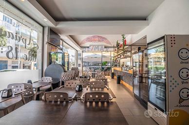 Il bar è completo di attrezzature professionali: lavastoviglie, erogatore acqua, macchina del ghiaccio, banco scalda vivande, lavabicchieri, due colonne frigo e macchina per granite e gelato soft Carpigiani.