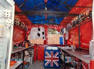 CHIOSCO BAR in perfette condizioni, omologato, dotato di progetto edile, impianto elettrico e idraulico, completamente smontabile per il trasporto. Compreso di tavoli da lavoro e lavandino. Telone di copertura intatto, impermeabile e ignifugo, di alta qualità. POSSIBILITA' DI CAMBIARE COLORE DEL TELO ESSENDO INERAMENTE SMONTABILE.