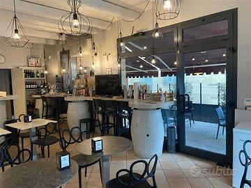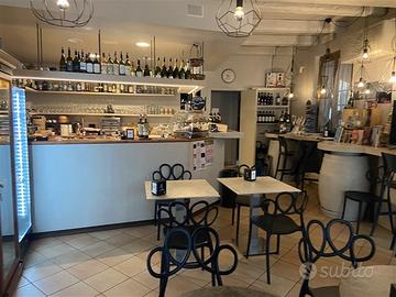 Piano terra (circa 50 mq): ingresso con bancone bar, tavolini con sedie, sedute a muro (circa 24 posti), cucina attrezzata, bagno e antibagno; plateatico esterno attrezzato con tavolini per 20 posti.