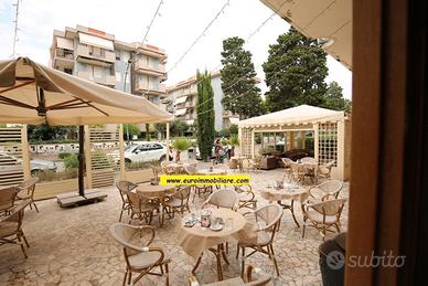 Composizione: ampio spazio esterno verandato con sedie, divanetti e tavolini, grande bancone con doppio affaccio,