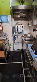 La cucina, in parte a vista con bancone gastronomia può senza problemi servire circa 20/25 posti a sedere al chiuso, 25/30 nel doppio dehors (cortile interne, e sotto i portici di via Brofferio).
