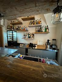 o bancone a L di circa 5 metri composto da un lavabo, vetrinetta caldo/freddo, work station (postazione con cocktail con lavabo), cassa, frigorifero sottostante, scompartimenti vari, vetrinetta frigo.
