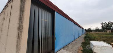 Capannone in area recintata e chiusa di notte, ampio parcheggio esterno, illuminazione e basico impianto elettrico. Le pareti laterali lunghe sono tutte costituire da portoni scorrevoli apribili, su ambo i lati, dunque molto accessibile senza dover spostare merce/mezzi ogni volta. Disponibile anche in variante con uffici interni e pareti in muratura, stessa metratura (1000 euro mese)