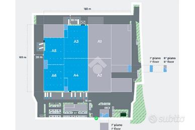 La zona uffici, di circa 500 mq, è dotata di riscaldamento e condizionamento autonomi. L'immobile è frazionabile nelle seguenti porzioni: 7.014 mq, 7.030 mq, 4.834 mq e 4.834 mq. È inoltre possibile, separatamente, locare ulteriori uffici nelle immediate vicinanze di 200 mq, 600 mq o 800 mq.