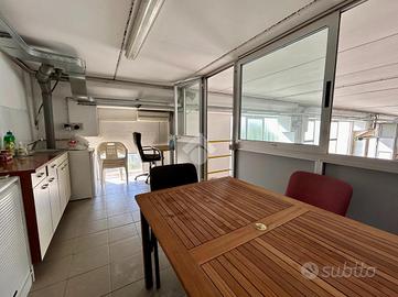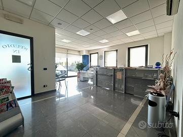 L'ingresso al piano terra ci accompagna nella parte dedicata ad uso ufficio di 120 mq, e si suddivide in; reception, tre uffici, archivio e sala d'attesa.