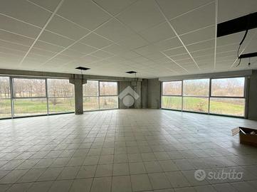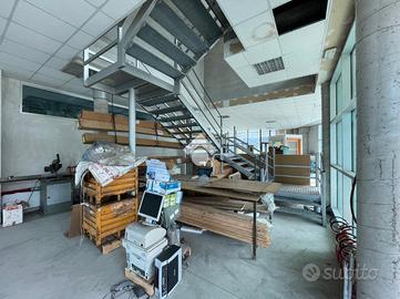 La soluzione si divide in parte produttiva ed espositiva oltre ai locali uso ufficio. Il magazzino retrostante ha una metratura di 347mq open space con un altezza di 7.70mt e accesso carraio. La parte frontale, collegata internamente col magazzino si sviluppa al piano terra come un area espositiva con vetrate che la rendono particolarmente luminoso e una metratura di 161mq per un altezza di 3.40. E' collegato da scala interna con il piano superiore di 158mq composto da locali uso ufficio. Completano il fabbricato i servizi igienici. La soluzione è dotata di tutta l'impiantistica e esternamente è presente un area privata recintata di 1570mq.