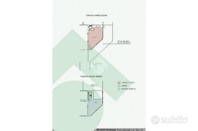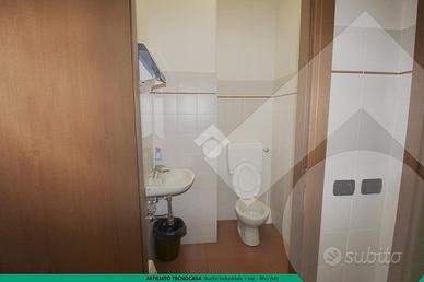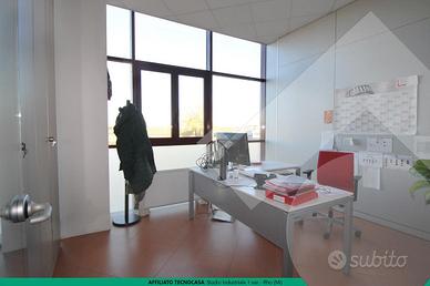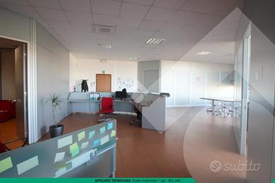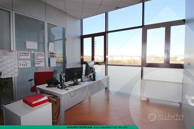 Interno al capannone, al primo piano, troviamo la zona UFFICI per un totale di 300 mq già arredata e suddivisa in tre locali più locale servizio e ripostiglio. Pavimento galleggiante. Ingresso interno. Serramenti in ferro con doppi vetri. Porte in vetro e alluminio. Doppi servizi igienici (maschio/femmina). Dotato dei seguenti IMPIANTI: illuminazione ed elettrico a norma di legge, fibra ottica, impianto telefonico e reti per computer, aria condizionata autonoma a pompa di calore, riscaldamento autonomo e impianto d'allarme.
