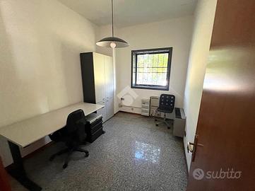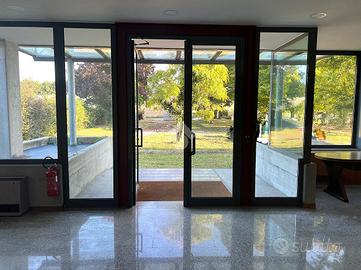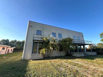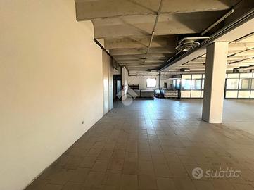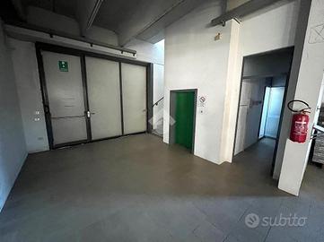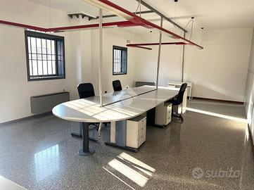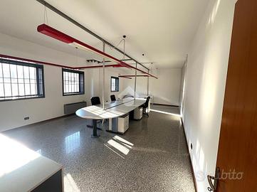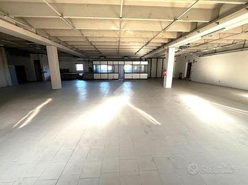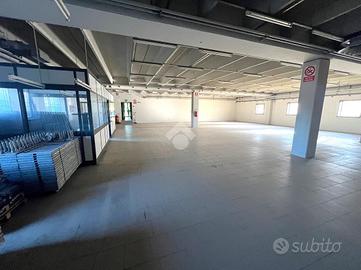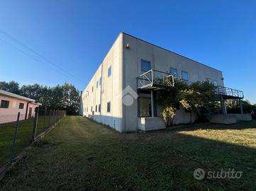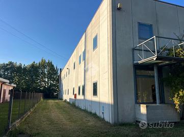 Attraverso il portico d'ingresso al piano terra si accede in quella che ora è adibita a reception, da cui si accede a tutti gli ambienti direzionali dell'immobile, composto da: 4 uffici, una sala riunioni, due bagni finestrati con antibagno; successivamente passando per il disimpegno ci troveremo nella zona stoccaggio dotata di doppio ingresso per lo scarico di grossi mezzi, zona mensa, spogliatoi, ufficio logistica e due bagni con doccia finestrati. Il primo piano, raggiungibile tramite 2 scale interne o l'ascensore, è composto da due laboratori di grandi dimensioni, un deposito e due bagni finestrati.