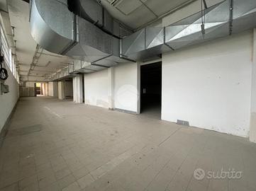 Su strada di forte passaggio, in zona centrale, proponiamo locale commerciale di ca 970 mq con numerosi servizi e spogliatoi; l'immobile consente solo attività Residenziali (DR) e Terziario (uffici, studi professionali, servizi finanziari, turismo e ospitalità, educazione e formazione, sanità, servizi professionali, trasporti e logistica, attività culturali, ricreative e sportive); in aggiunta al massimo una struttura fino a 250 mq (negozio di vicinato) su tutta l'area. In aggiunta, non conteggiato nel canone, viene incluso nella soluzione il negozio accanto di ca 300 mq, dotato anch'esso di servizi, spogliatoio e magazzino.