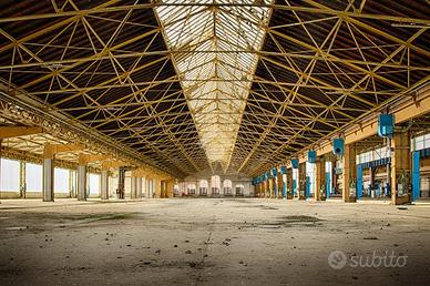 L'accesso al capannone avviene tramite tre portoni di 3.5 metri ciascuno che si aprono su di un vasto openspace, interrotto da pilastri che suddividono l'ambiente in due campate, provvisto di mensole per l'inserimento di un carroponte di 30 tonnellate.