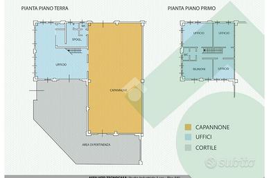 Interno al capannone troviamo la zona UFFICI disposta su 2 livelli (piano terra e primo ) per un totale di 230 mq suddivisa in 4 locali oltre a un ampio open-space. Pavimentazione in cemento al piano terra e in gress porcellanato al primo piano, porte in legno e controsoffitto a quadrotti. Sono presenti i doppi servizi igienici. Dotati dei seguenti IMPIANTI: illuminazione, elettrico e riscaldamento/raffreddamento autonomo.