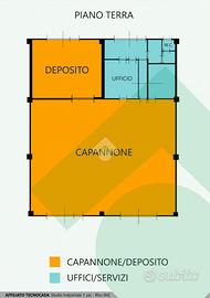 Il CAPANNONE si trova al piano terra e ha una superficie totale di 100 mq con l'altezza che varia de 5 m a 6,0 m al culmine. Al piano terra è presente un soppalco removibile con relativa scaffalatura che ottimizza gli spazi interni, oltre i servizi igienici. Il pavimento del capannone è in cemento, in buone condizioni e gli infissi in u-glass. Il tetto e' stato rifatto con copertura in pannelli sandwich.