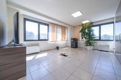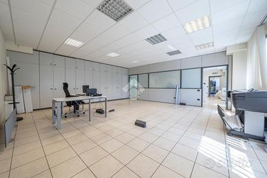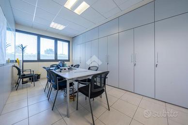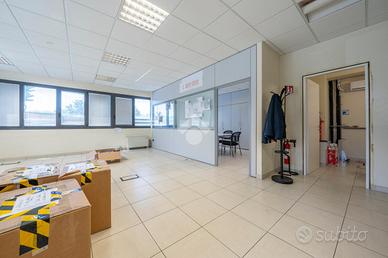 L'area uffici complessivamente di 450 mq si dispone su 2 piani e tutti gli ambienti e le sale riunioni sono completi di pareti attrezzate e tende. L'impianto elettrico presenta le torrette per le scrivanie, tutta la rete lan è cablata ed il riscaldamento e raffrescamento è affidato ad una pompa di calore con fancoil.