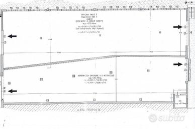 -Capannone 3 - 300 mq con altezza interna di 4,20 metri dotato ti un portone con le seguenti misure: larghezza 5,25 m e altezza 4,40 m; luci e uscite d'emergenza; impianto elettrico e d'illuminazione da rivedere; spogliatoio/doccia;