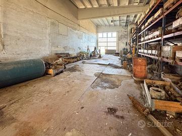 -Capannone 1 - 300 mq con altezza interna di 7,60 metri dotato di due portoni con le seguenti misure: larghezza 5 m e altezza 4,60 m (portone 1); larghezza 4,9 m e altezza 4,60 m (portone 2); luci e uscite d'emergenza; impianto elettrico e d'illuminazione da rivedere; spogliatoio/doccia;