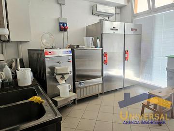 Sul retro troviamo il laboratorio professionale completo di tutte le attrezzature necessarie: mantecatore, abbattitore, frigoriferi negativo e positivo con ante inox, lavandini doppi in acciaio inox ed ampio piano lavoro. Sono inoltre presenti un magazzino funzionale per lo stoccaggio delle materie prime e uno spogliatoio riservato al personale con antibagno e bagno separati secondo la normativa vigente.