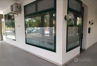 Tre vetrine,grande sala e tre bagni con antibagno,tutte arredate,una camera adibita per cucina con acqua e gas, un'altra stanza e un grande corridoio che unisce le stanze,aria condizionata inverter,spazio per carico/ scarico/ parcheggio per breve periodo.