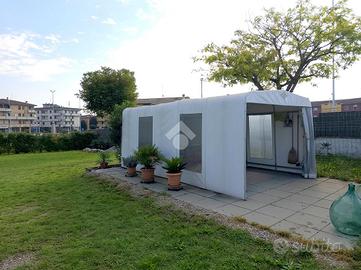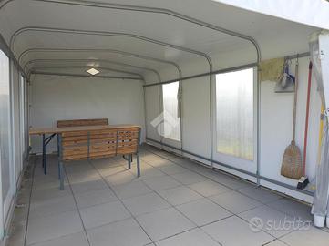 Adiacente ad un ampio gazebo con telo impermeabile in PVC è stato creato un grande orto con tante varietà di colture.