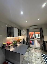 Al piano superiore troviamo un appartamento così composto: sala da pranzo, soggiorno, cucina abitabile, tre camere da letto e due bagni; venduto arredato. Ulteriore plus è la presenza di un terrazzo. L'ingresso all'appartamento è separato dal capannone.