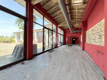 il piano terra di circa 450 mq suddivisi in molteplici locali con zona cucina con doppia canna fumaria e circa 250mq di soppalco collegati internamente tra di loro tramite scala e ascensore.