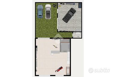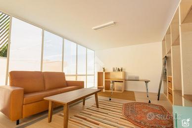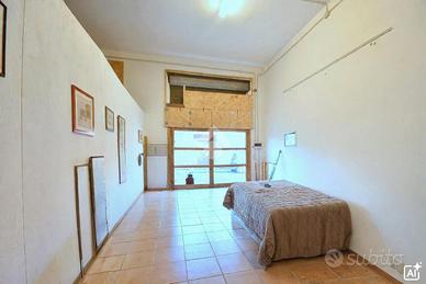 Il locale è composto da un ampio spazio principale ben illuminato da due grandi porte vetrate, un soppalco sulla parete destra accessibile tramite una caratteristica scala, e un comodo cortile interno raggiungibile tramite una porta sul lato opposto dell'ingresso. Lo spazio esterno ospita un pratico locale di sgombero sulla destra utile per il magazzinaggio o come deposito e un bagno dotato di impianto doccia che completa la proprietà.