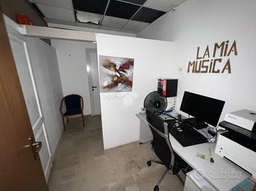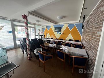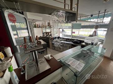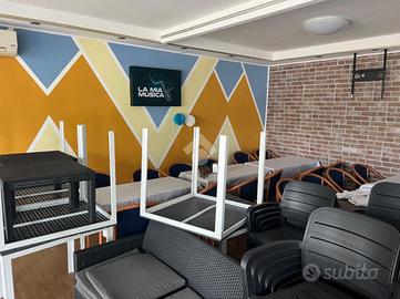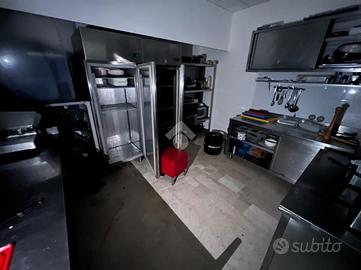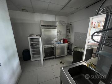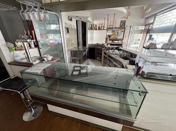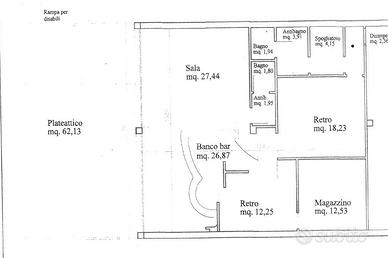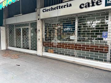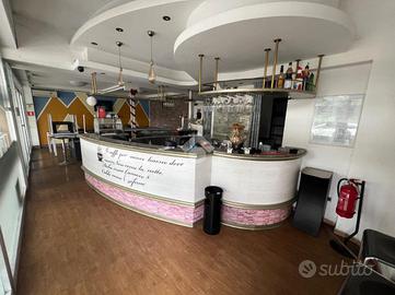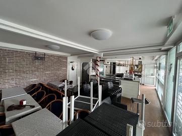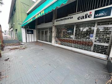 La soluzione attualmente adibita a bar è divisa in due parti: la prima è composta da un plateatico di proprietà e recintato dal quale si accede alla sala interna principale del locale dotata di zona bar, cucina, magazzino e 2 bagni; la seconda parte accessibile tramite un disimpegno e composta da un ampio magazino, un piccolo ufficio, 2 bagni, spogliatoio, e zona carico/scarico merci.