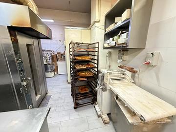 Laboratorio già organizzato con zona impasti, cottura e preparazione.