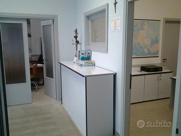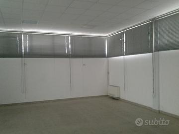 con due porte vetrate, composti da 2 uffici, sala mostra, magazzino o laboratorio + disimpegno e servizi. Riscaldamento, aria condizionata, buone finiture, a livello strada con piazzale recintato. Rete e prese ethernet, wifi attiva, impianto elettrico con allaccio pronto 220 e 380,