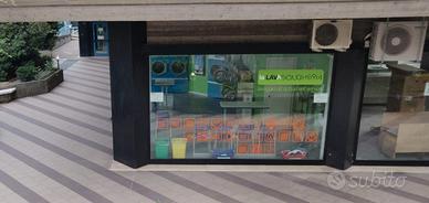 La lavanderia si sviluppa su una superficie di circa 60 mq, collocata ad angolo e caratterizzata da tre ampie vetrate affacciate su due vie di forte passaggio.